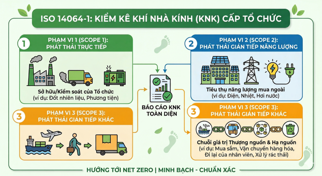 Khác với các tiêu chuẩn môi trường chung chung, ISO 14064-1 mang tính định lượng cao. Tiêu chuẩn này yêu cầu tổ chức phải xác định rõ ranh giới phát thải, phân loại các nguồn phát thải thành 3 phạm vi (Scope):